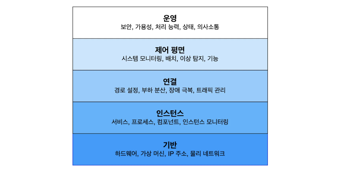 - 운영 고려 설계의 5단계 관점: 기반 → 인스턴스 → 연결 → 제어 평면 → 운영