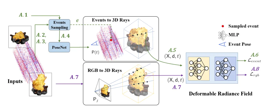 이를 통해 event가 발생한 시점에서의 Camera pose와 (x, y) location을 활용하여 event를 world 좌표계의 3D space로 projection할 수 있게 된다. 그 후에 Ray를 따라 3D space에서의 event point ()를 sampling할 수 있게 되고, 해당 point에서의 radiance와 density를 추정할 수 있다.