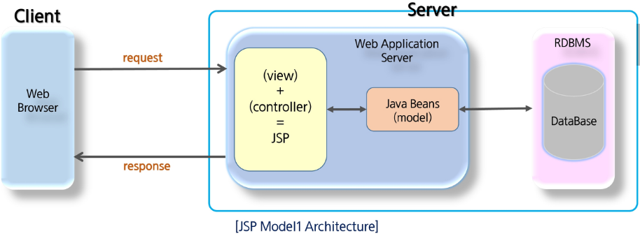 | 출력을 위한 view(html) 코드와 로직 처리를 위한 java 코드가 분리 되었기 때문에 JSP는 Model1에 비해 코드가 복잡하지 않다. | 구조가 복잡하여 초기 진입이 어렵다. |