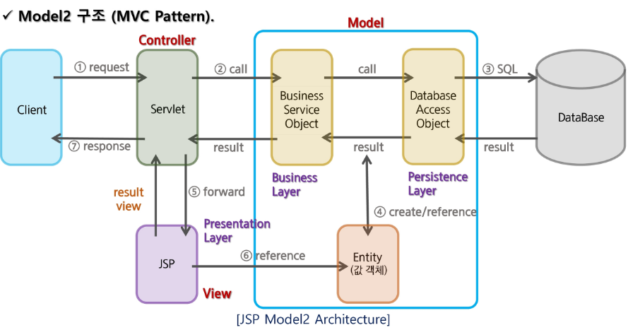 | JSP | View | 모든 화면 처리를 담당. Client의 요청에 대한 결과 뿐 아니라 controller에 요청을 보내는 화면단도 jsp에서 처리한다. Logic처리를 위한 java code는 사라지고 결과 출력을 위한 code만 존재. |