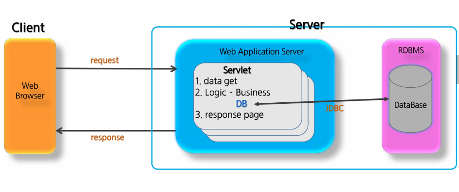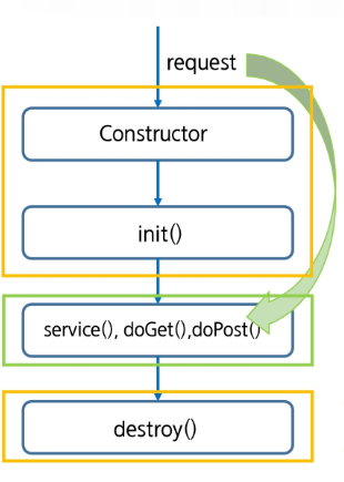 - Client가 요청(request)을 하게 되면 Servlet Container는 Servlet 객체를 생성(한번만)하고, 초기화(한번만) 하며 요청에 대한 처리(요청시마다 반복)를 하게 된다. 또한 Servlet 객체가 필요 없게 되면 제거하는 일까지 Container가 담당하게 된다.