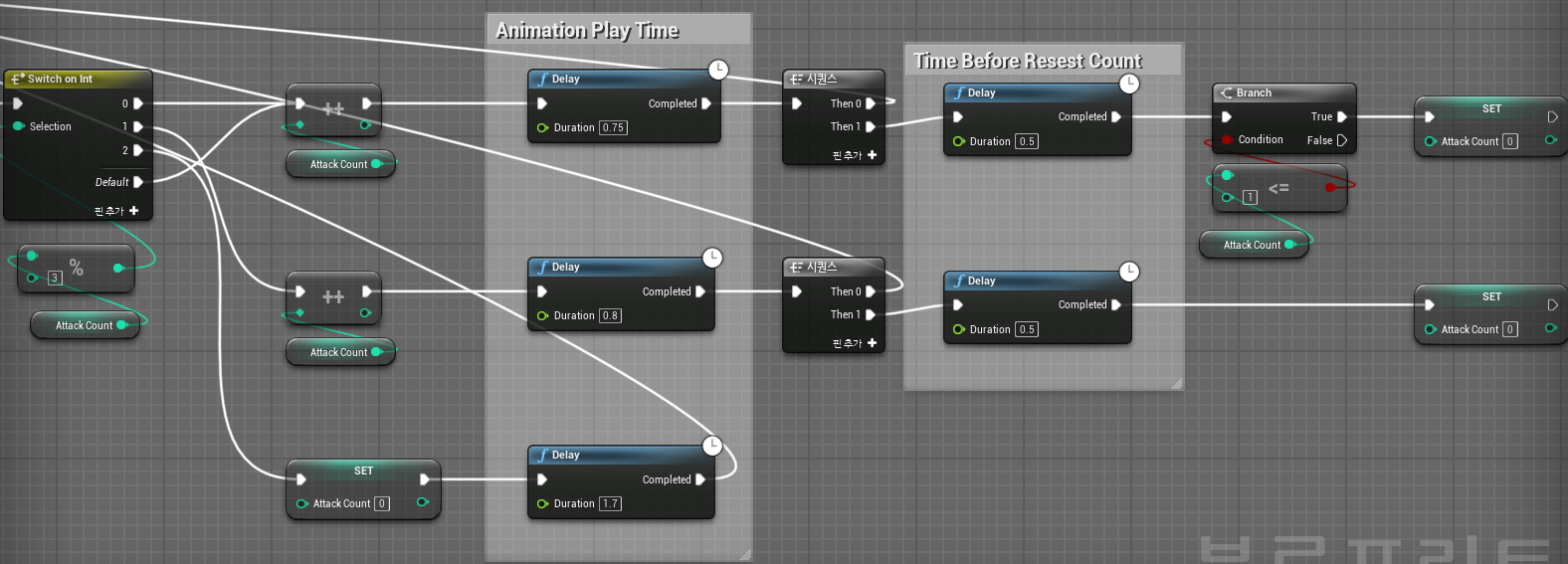 현재 Attack Count에 +1현재 재생 중인 몽타주의 재생 시간에 맞춰서 설정Then 0: Dealy-Duration 이후 DoOnce-Reset 입력에 연결하여 다음 공격 로직 실행 가능하도록 함Then 1: Delay 이후 Attack Count를 0으로 초기화시킴Duration 이후 Attack Count 초기화 로직현재 AttackCount 값이 1 이하인 경우에만 0으로 초기화'AttackCount 값이 1 이하?' 다음 공격이 진행 중이 아니라는 의미◼️ Switch Case: 1
