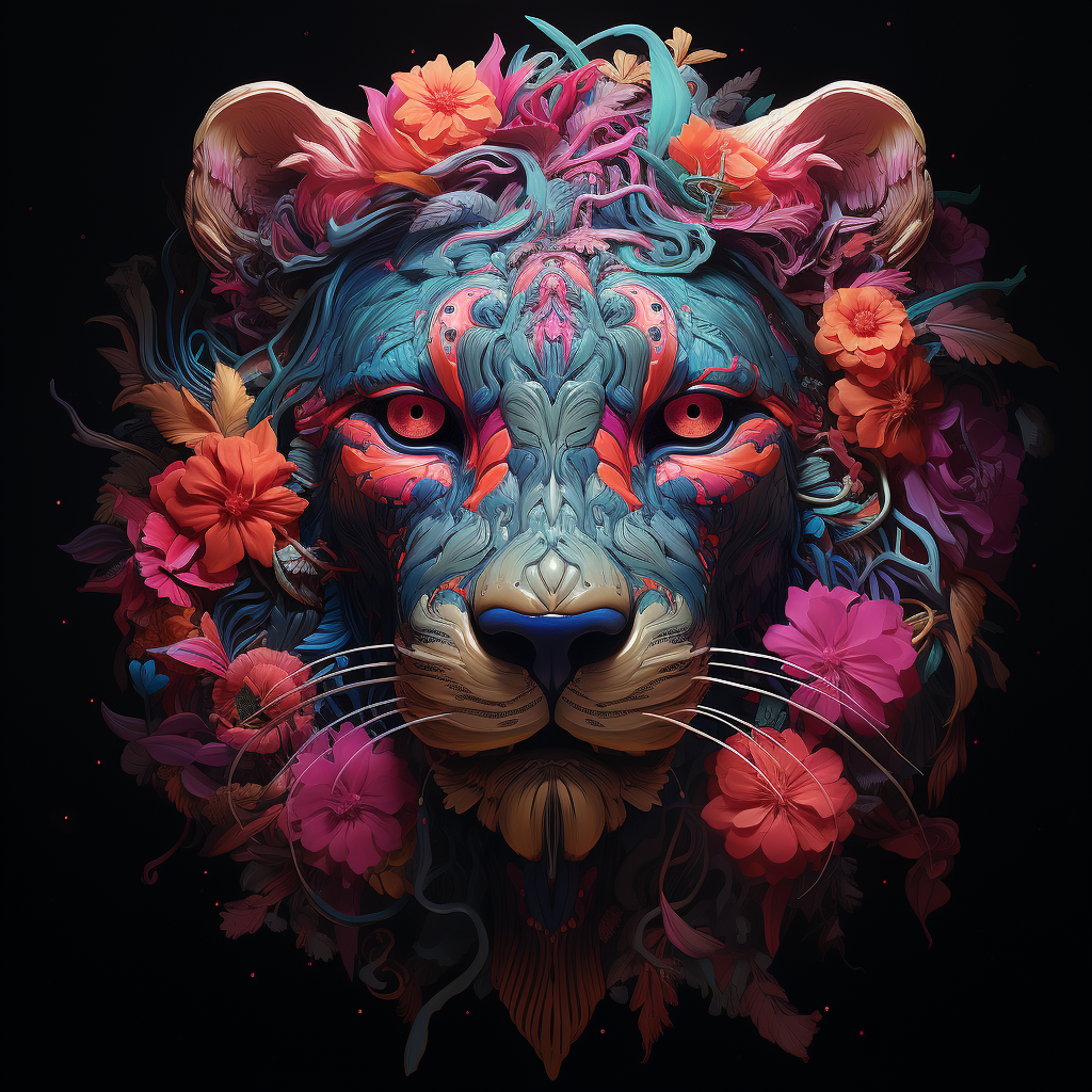 사자의 얼굴에 꽃과 식물들이 자연스럽게 어울리는 것을 확인할 수 있습니다.