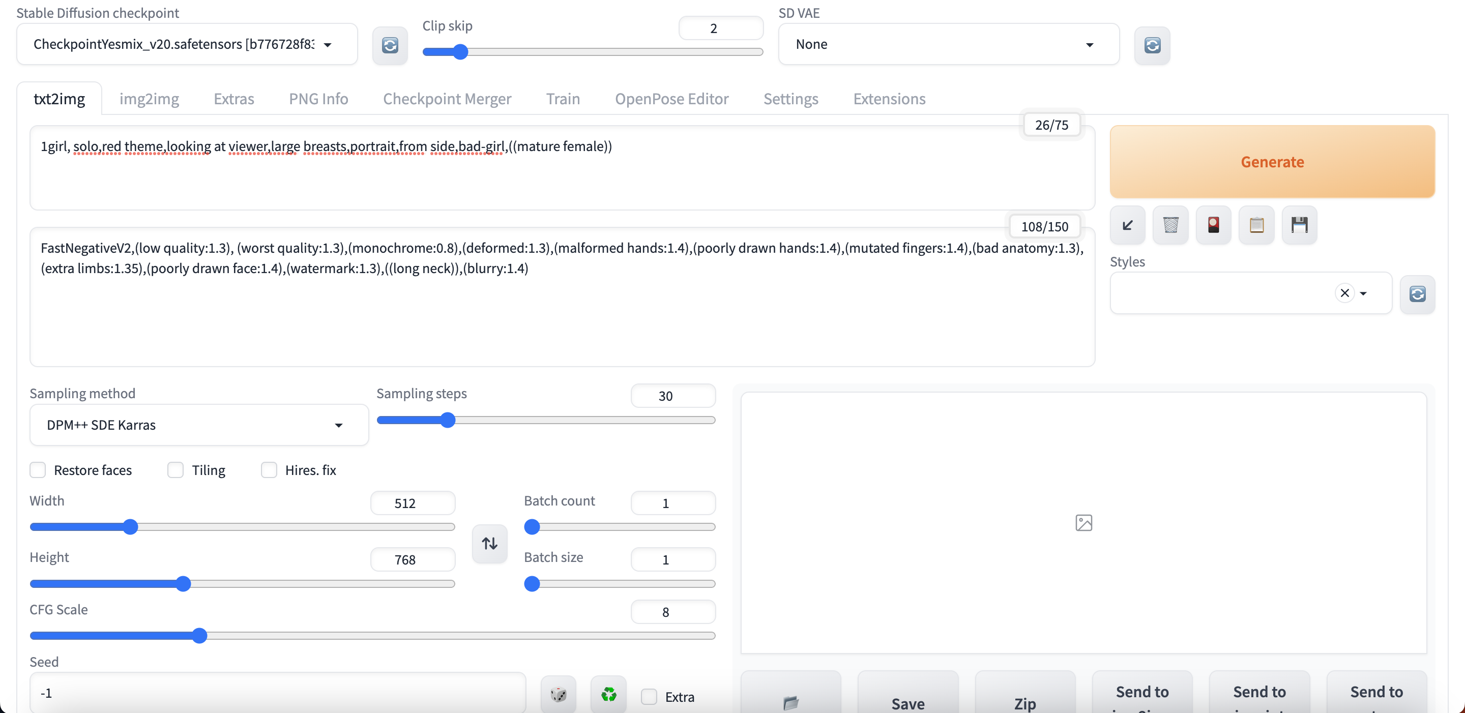Sampler같은 경우 DPM++ 2M Karras, DPM++ SDE Karras가 사용되는데 CivitAI에서 오타가 난 것 같아 DPM++ SDE Karras로 사용하도록 하겠습니다.
