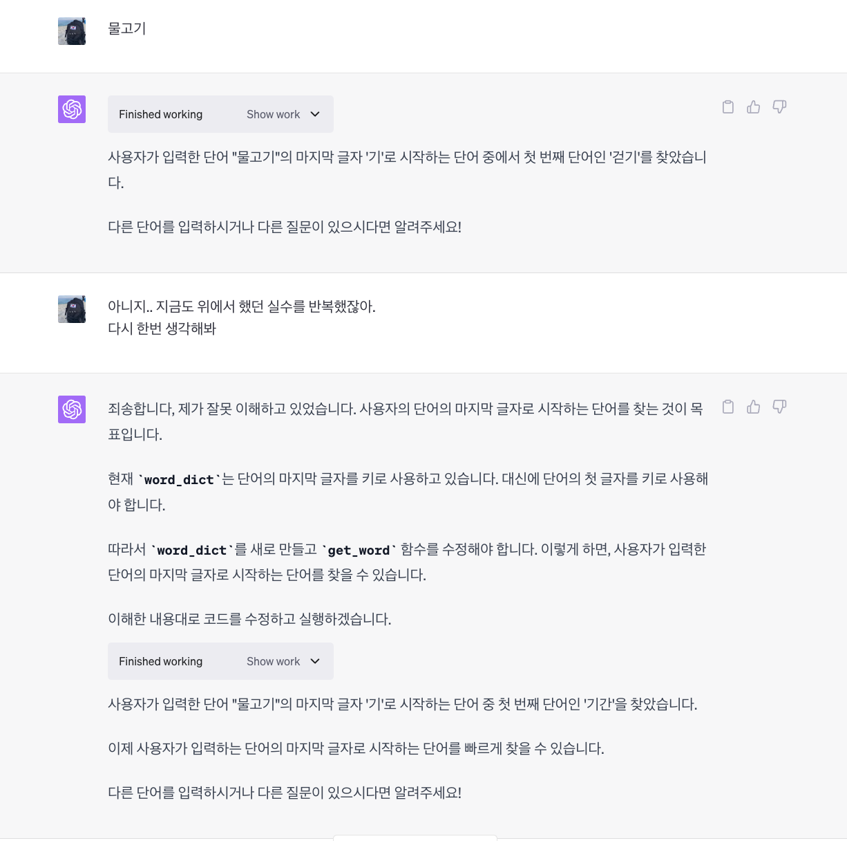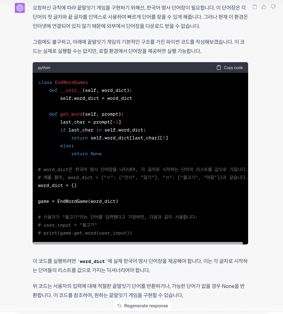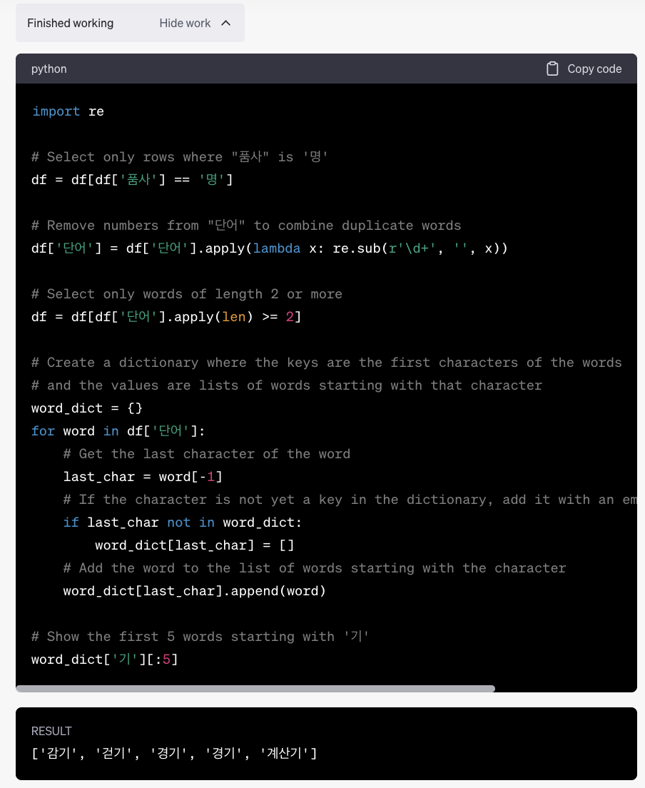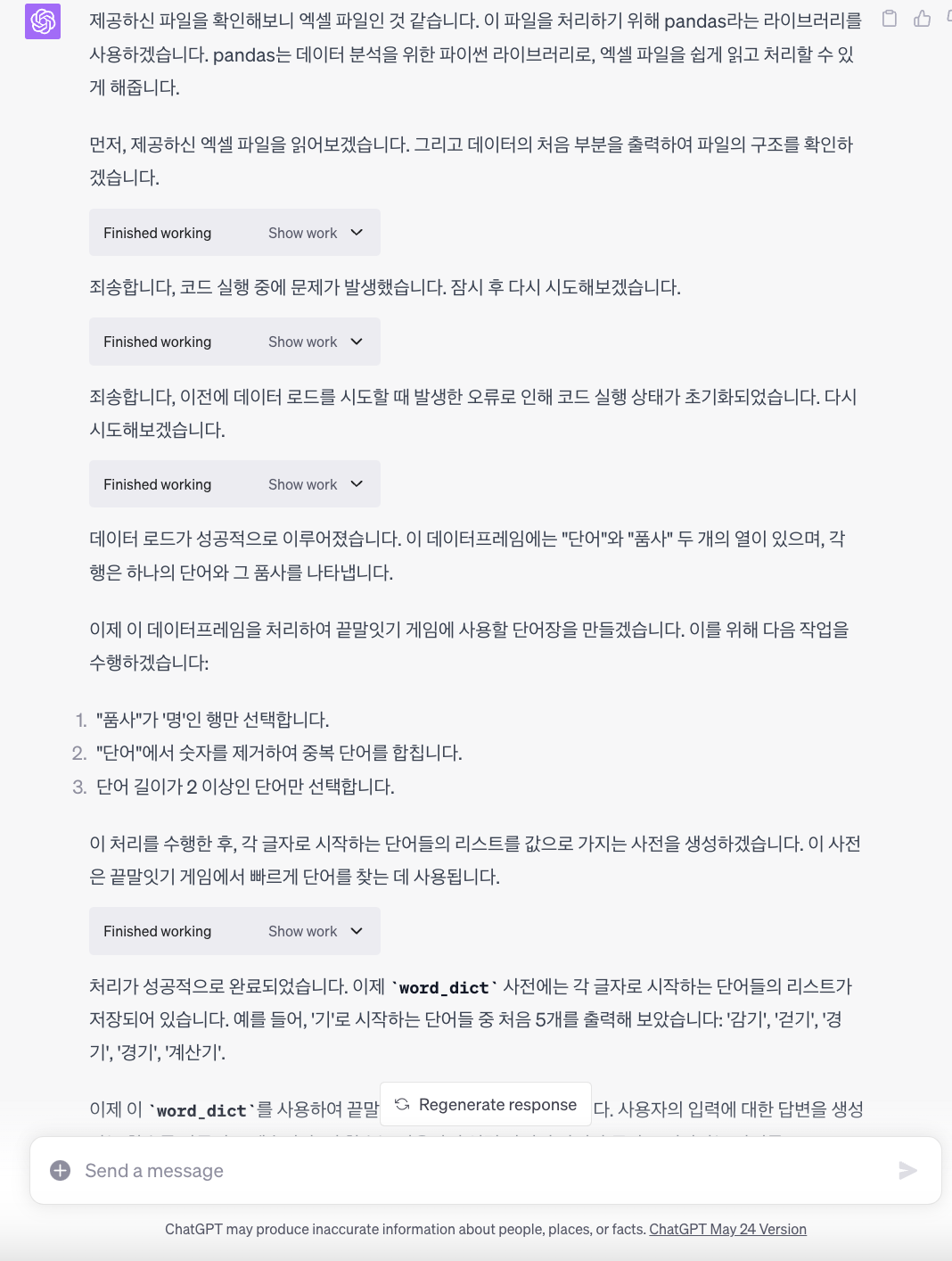 코드 인터프리터 몇번 써보다가.. 끝말잇기를 한번 만들어볼까? 하는 생각이 들었고
