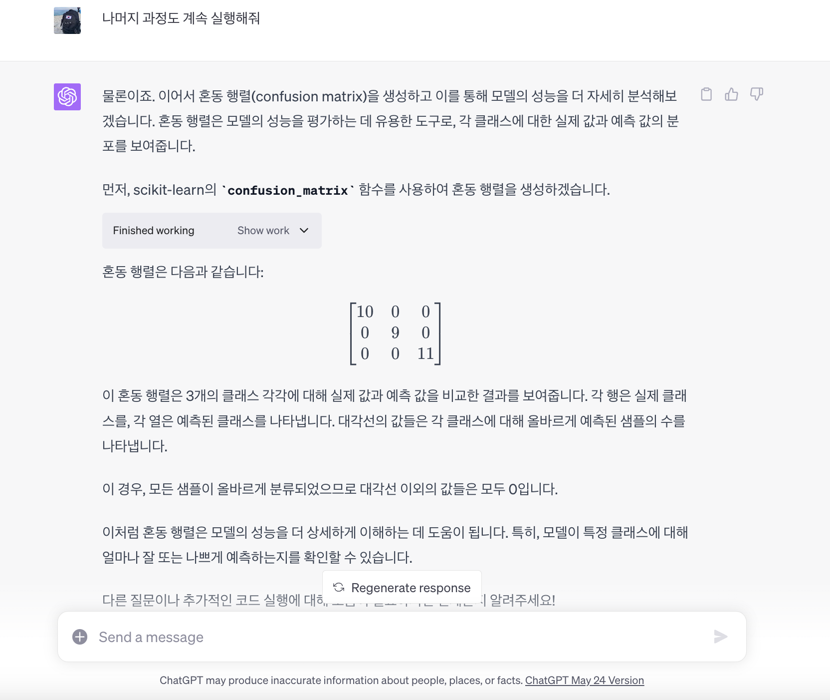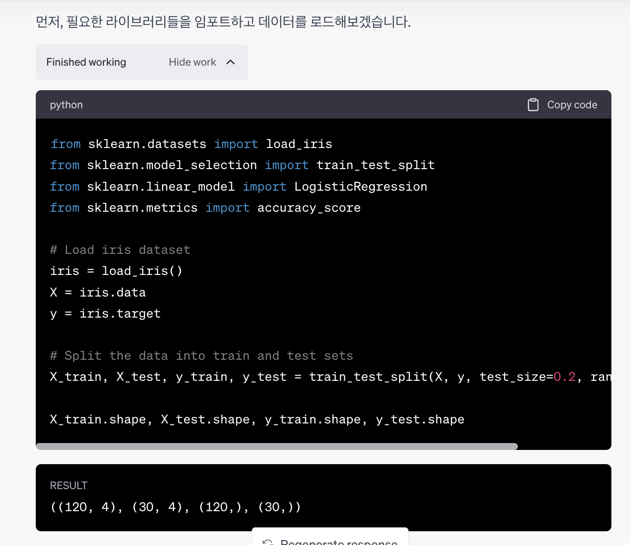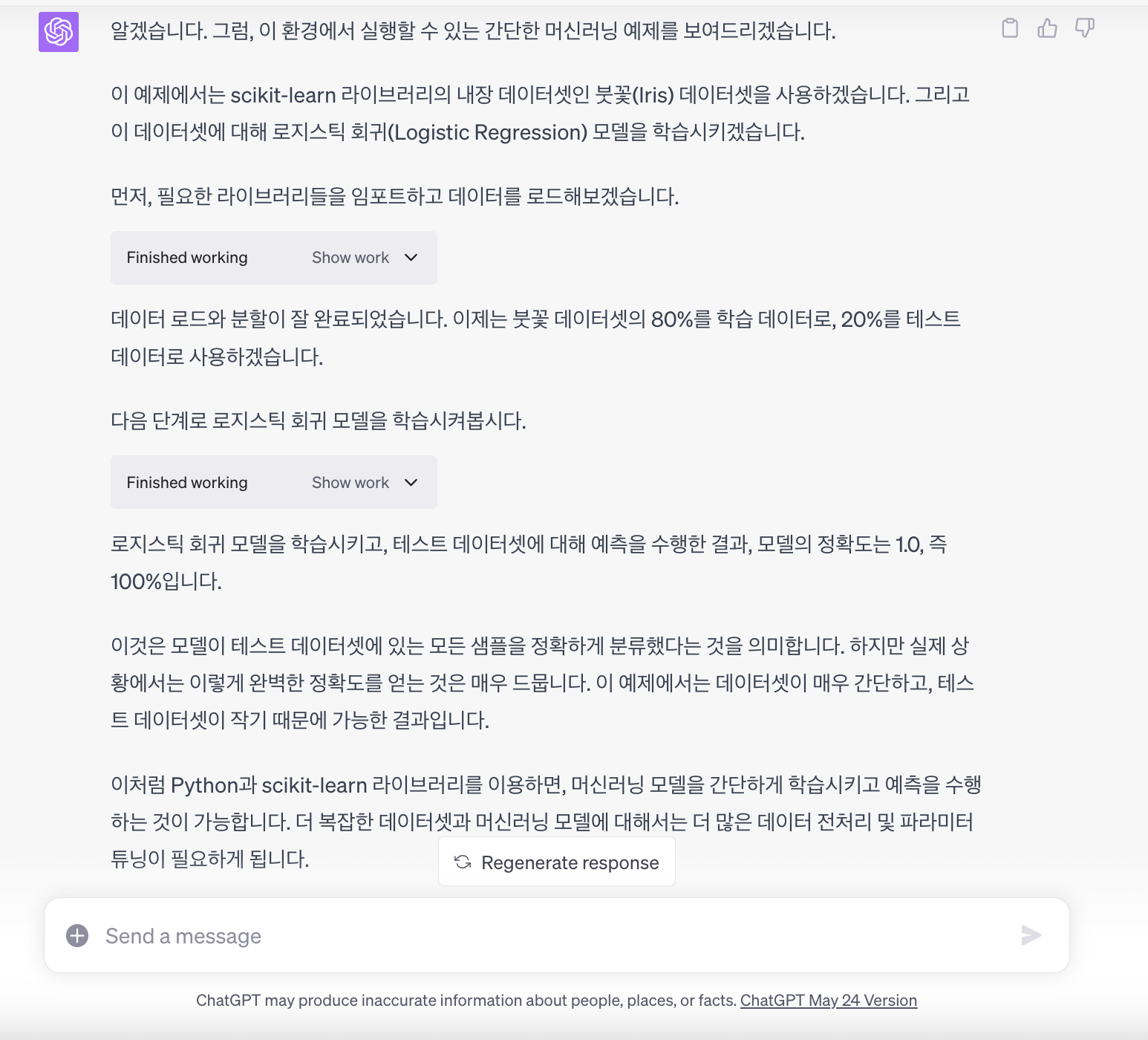 GPT에게 머신러닝 예제를 보여달라고 부탁했습니다.