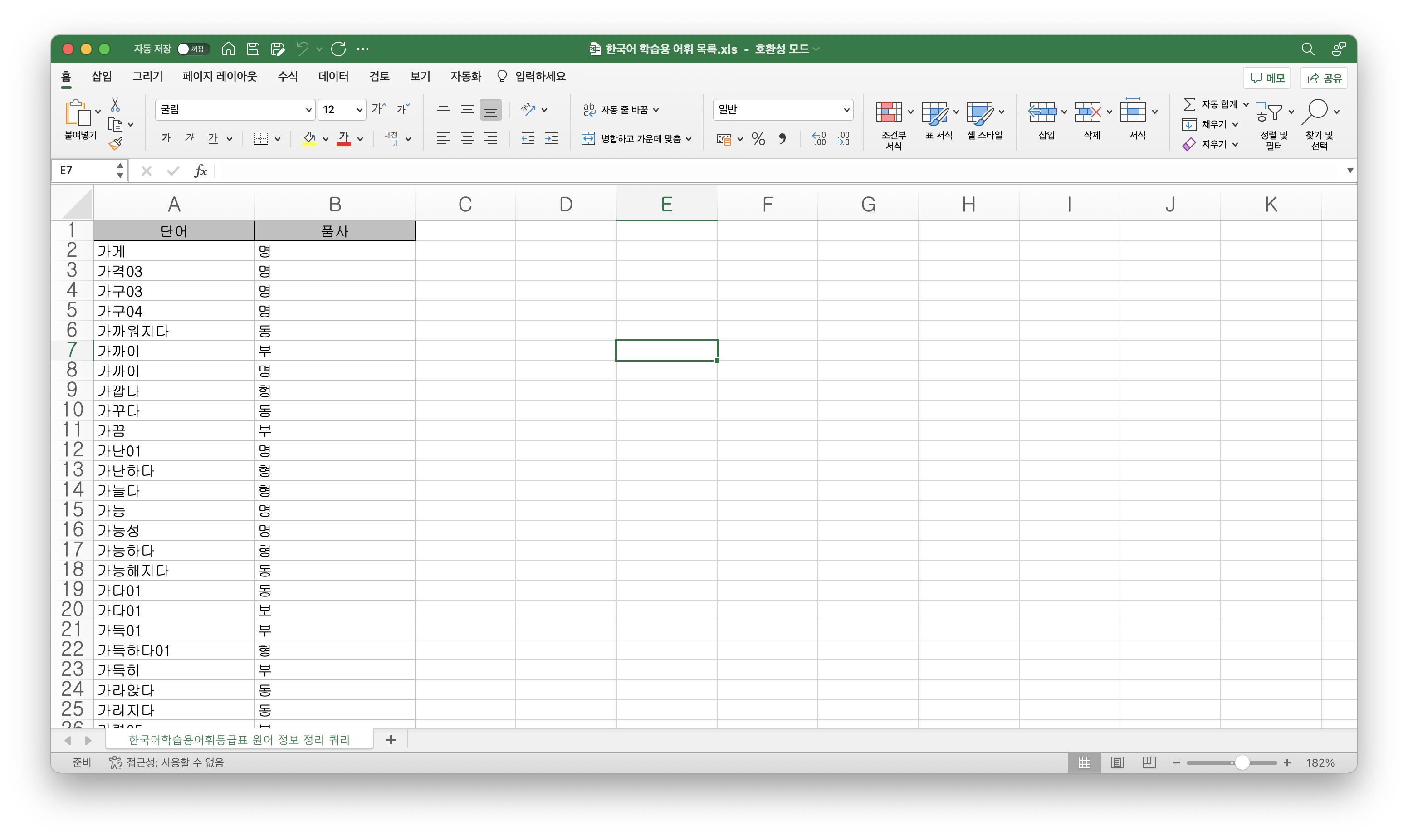 단어장이 필요하다고 해서 국립국어원에서 엑셀 파일을 다운받았습니다.