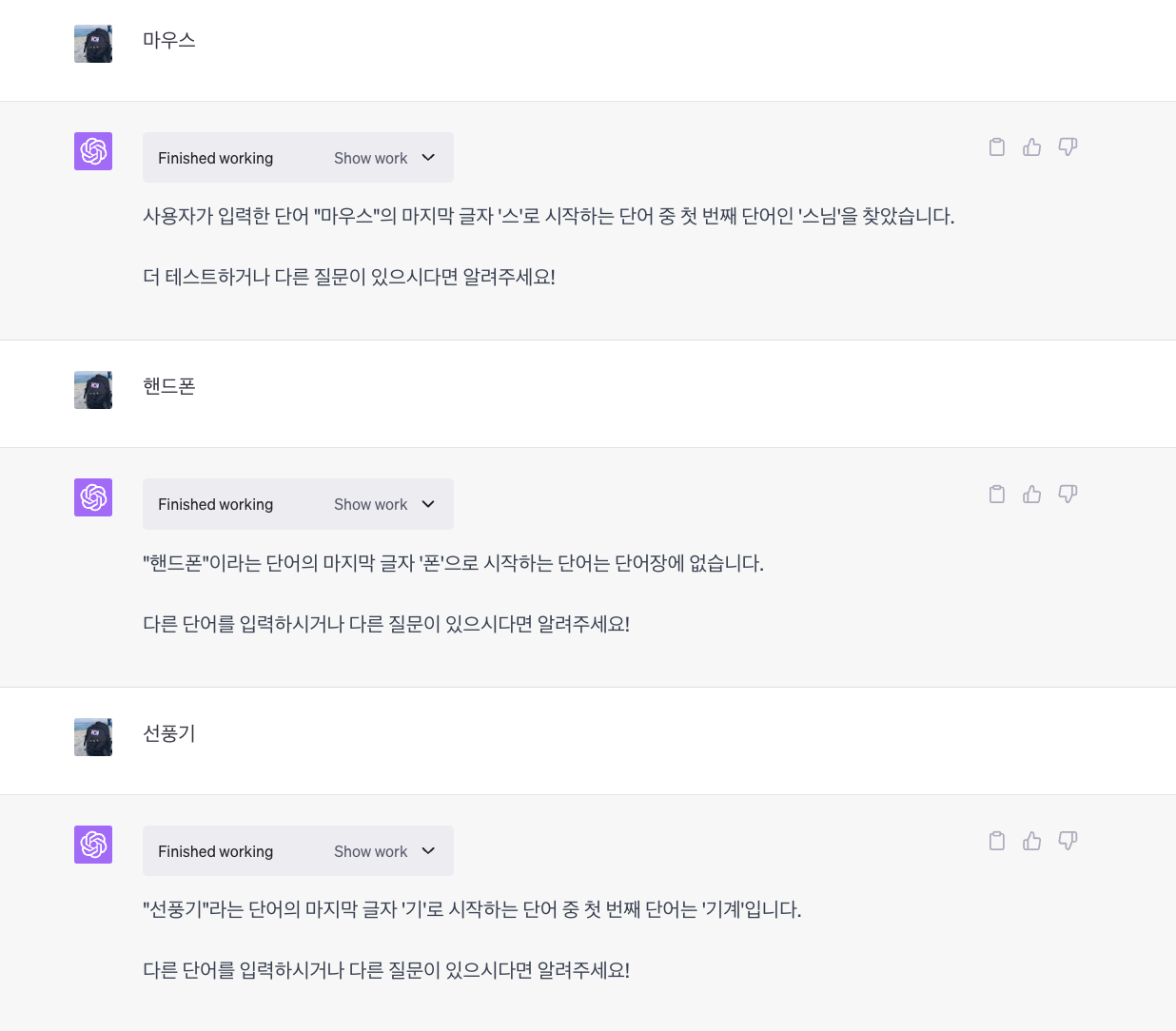 저는 GPT와 함께 끝말잇기를 만들며 30분도 안되는 시간에 구현할 수 있었습니다.