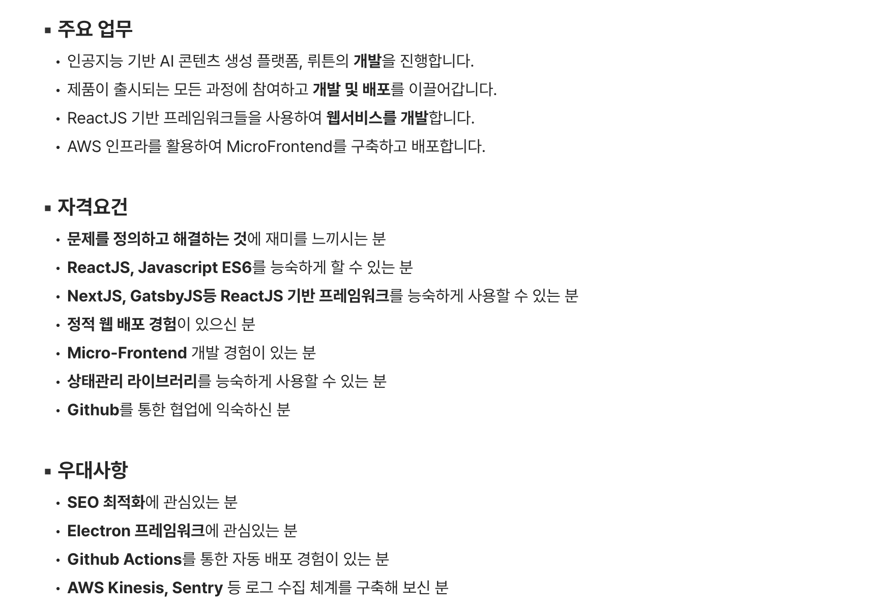경력이 1년 이상인 것으로 보아, 뤼튼에 이미 프론트엔드 개발자가 있는 것으로 추측되며.. 업무를 보조하는 역할을 할 듯 해 보입니다.