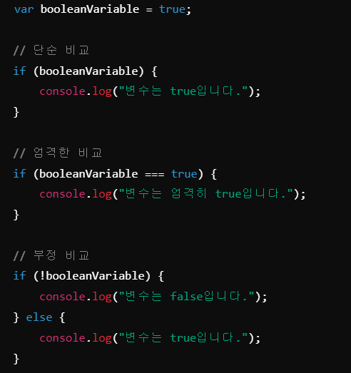 ▪️ 엄격한 비교: if (booleanVariable === true)와 같이 === 연산자를 사용하여 변수가 정확히 true인지 확인(값 비교 + 데이터 형식 비교)
