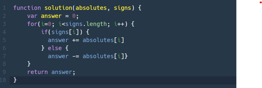 absolutes[i] = -absolutes[i]; // signs[i]가 false일 때는 absolutes[i]를 음수로 변환하고, 그 값을 answer에 더한다