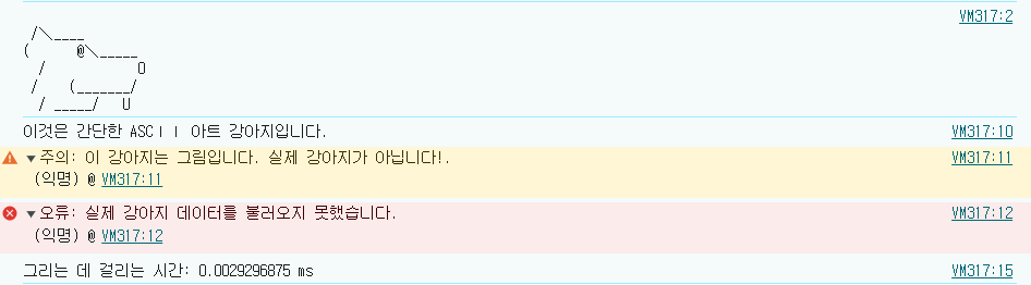 console.warn('주의: 이 강아지는 그림입니다. 실제 강아지가 아닙니다!.');