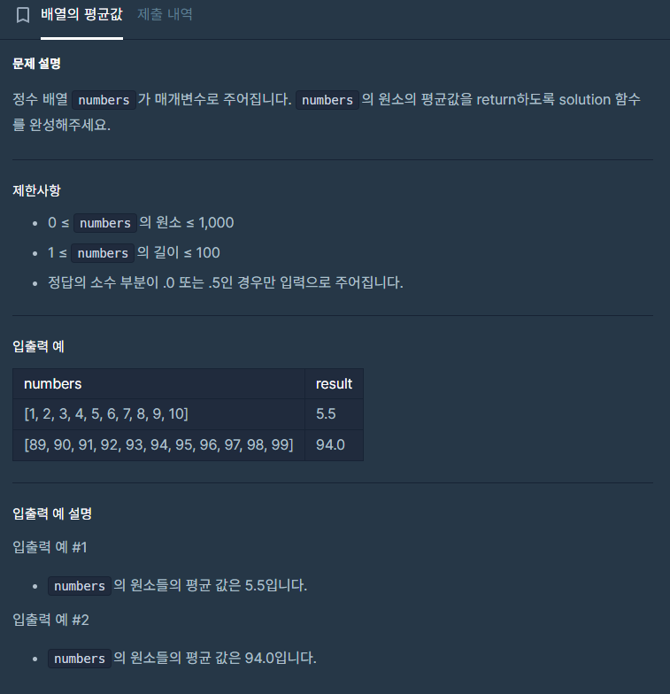 for 반복문을 사용해서 원소의 합을 구한 후 원소의 길이로 나누는 풀이 방법을 생각해보았다.