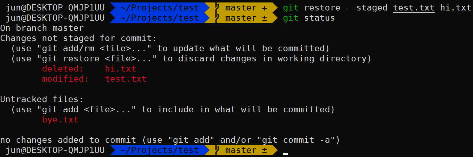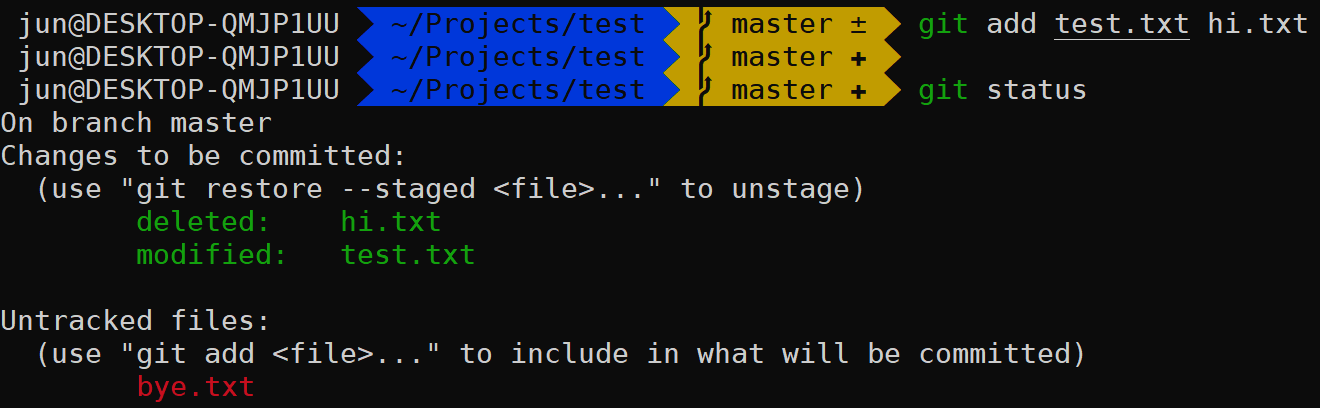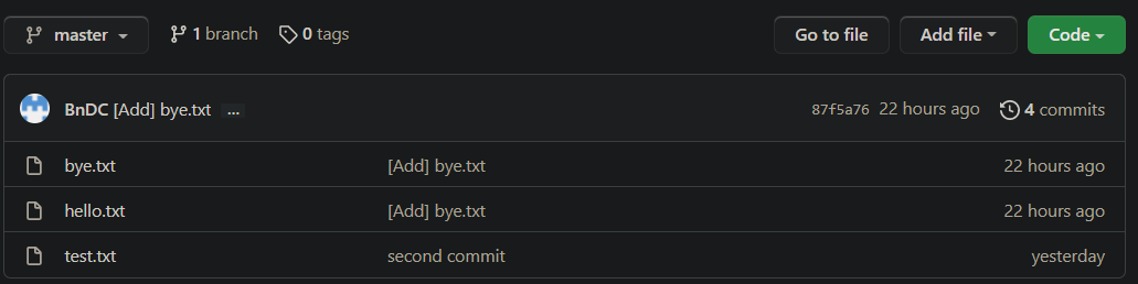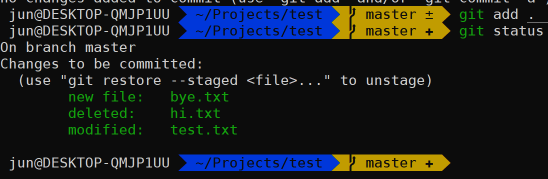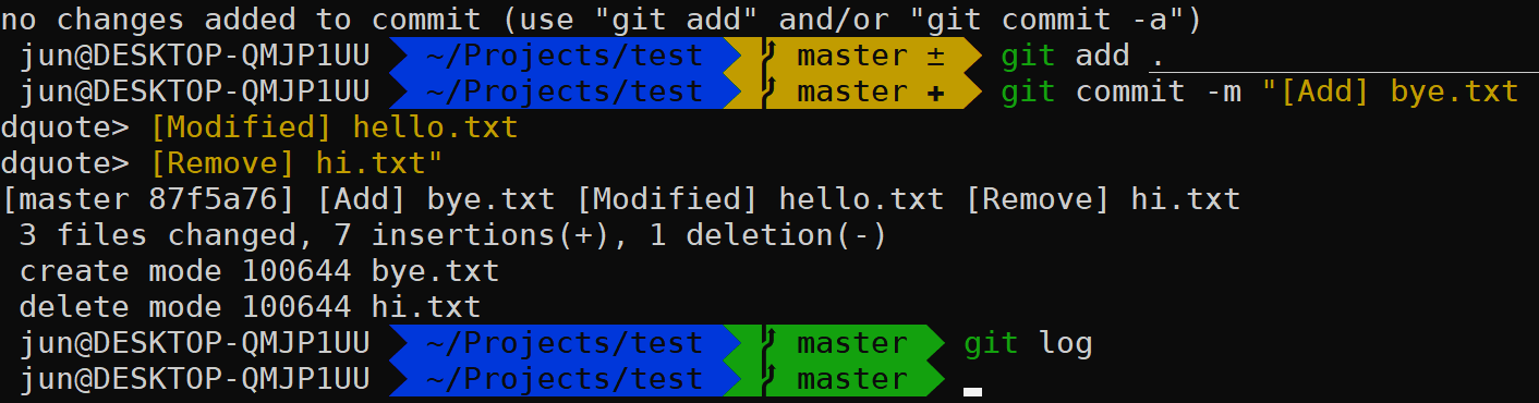 (bye.txt 생성, test.txt 수정, hi. txt 삭제)