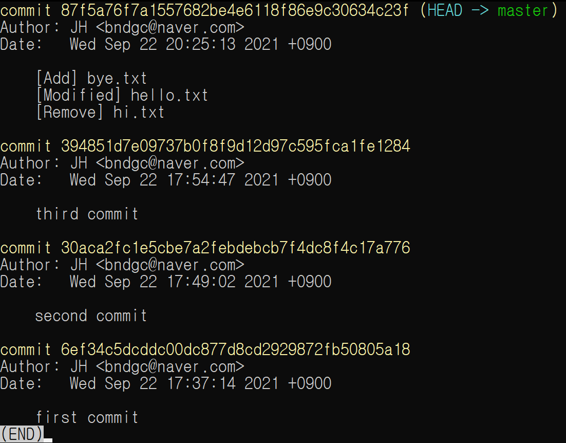 log는 각 commit에 대한 (작성자, hash 값, 날짜와 시간, 커밋 메세지 등) 자세한 정보를 담고 있다.