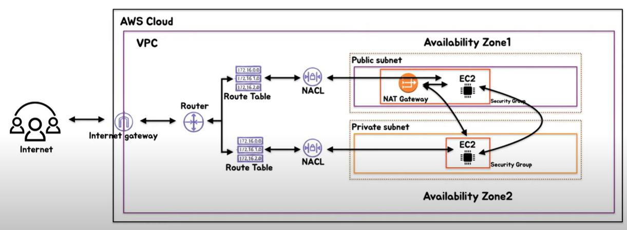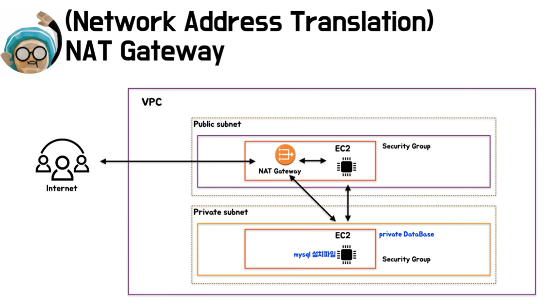 private subnet(database는 NAT Gateway를 통해 자신의 IP를 노출하지 않고 mysql 설치파일을 가져올 수 있다.)