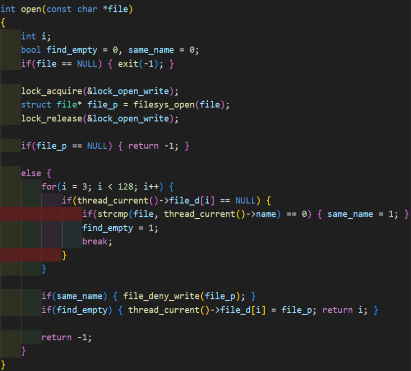넘겨 받은 파일이 존재하지 않다면 exit(-1)를 호출한다. filesys_open(Kernel API)를 호출할 때 open 과 write 사이에 사용되는 lock을 걸어준다. 0(STDIN), 1(STDOUT), 2(STDERR)을 제외하고 3부터 file descriptor의 최대 크기인 128까지 fd number를 1씩 더해가며 NULL인 곳을 찾는다. 만약, NULL이지만 실행되고 있는 파일이 있다면 접근할 수 없도록 file_deny_write를 호출해준다. 위 작업을 모두 마친 후 filesys_open을 통해 open된 file을 찾아낸 file descriptor와 연결해준다.