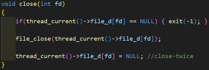 fd number에 해당하는 file descriptor가 NULL이라면 exit(-1)을 통해 오류임을 알린다. 만약, NULL이 아니라면 file_close(Kernel_API)를 호출하여 open file을 close 해준다. 마지막으로 close된 file descriptor에 다시 열릴 수 있도록 NULL을 할당한다.