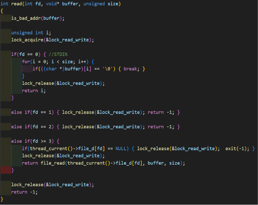 넘겨 받은 파일이 존재하지 않다면 exit(-1)를 호출하는 과정은 open에서 선행되기 때문에 해줄 필요가 없다. (read와 write) 그리고 (open과 write) 사이에 critical section의 침범 오류를 방지하기 위해서 lock_read_write와 lock_open_write를 사용하였다. write가 시작되기 전에 lock_acquire로 read와 write 사이 그리고 open과 write 사이를 lock 해준다.fd number가 1이라면 STDOUT이기 때문에 buffer을 통해 write하고 lock_release로 lock을 모두 풀어준다. 0, 2는 각각 STDIN, STDERR이기 때문에 lock을 풀어주고 return 해준다. 하지만, fd number가 3이상일 때는 fd number에 해당하는 file descriptor를 가져와주고 해당 file descriptor의 fd 가 NULL이라면 write 없이 lock을 모두 풀어주고 exit(-1) 해준다. write할 파일이 있다면 file_write(Kernal API)를 사용하여 file을 읽어준다. 각각의 return이나 exit(-1) 앞에 lock_release(&lock_read_write), lock_release(&lock_open_write)를 붙여줌으로써, (read와 write) 그리고 (open과 write)는 critical section을 침범하지 않게 해주었다.