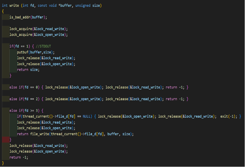 넘겨 받은 파일이 존재하지 않다면 exit(-1)를 호출하는 과정은 open에서 선행되기 때문에 해줄 필요가 없다. read와 write 사이에 critical section의 침범 오류를 방지하기 위해서 lock_read_write를 사용하였다. read가 시작되기 전에 lock_acquire로 lock 해준다.fd number가 0이라면 STDIN이기 때문에 buffer을 통해 read하고 lock_release로 lock을 풀어준다. 1, 2는 각각 STDOUT, STDERR이기 때문에 lock을 풀어주고 return 해준다. 하지만, fd number가 3이상일 때는 fd number에 해당하는 file descriptor를 가져와주고 해당 file descriptor의 fd 가 NULL이라면 read 없이 lock을 풀어주고 exit(-1) 해준다. read할 파일이 있다면 fild_read(Kernal API)를 사용하여 file을 읽어준다. 각각의 return이나 exit(-1) 앞에 lock_release(&lock_read_write)를 붙여줌으로써, read와 write는 critical section을 침범하지 않게 해주지만 open과는 동시에 일어날 수 있도록 해주었다.