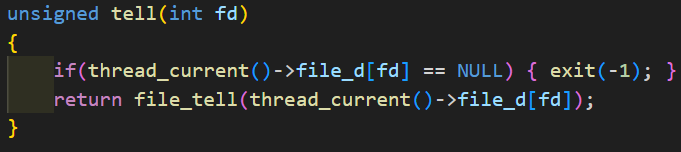 fd number에 해당하는 file descripor가 NULL이라면 exit(-1)을 호출한다. 만약, NULL이 아니라면 file_tell(Kernel API)를 호출하여 pos의 next byte를 return 해준다.