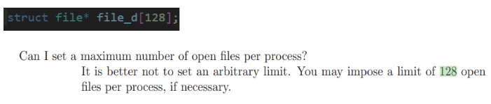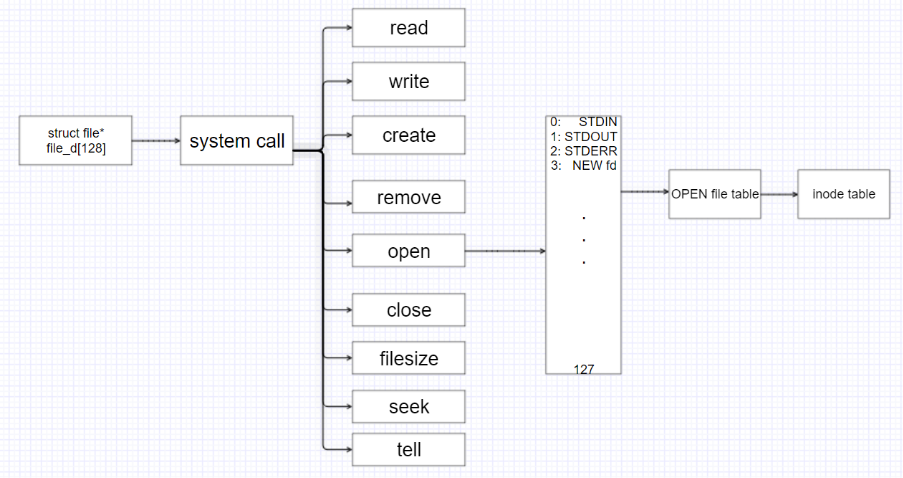 또한, strcut file file_d[128]을 추가해 줌으로써 open한 fd number에 해당하는 file을 point 가 가능하게 해주어 file system call들을 다룰 수 있게 만들어주었다.