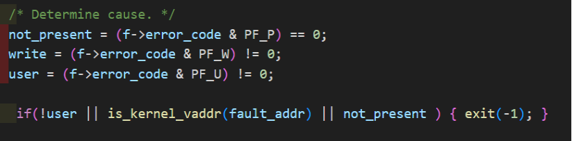 bad-jump, bad-write, bad-read test fail을 해결하기 위해서 exception.c if 조건문에 not_present를 추가하였다. mapping이 안된 주소를 page fault handler를 통해 처리함으로써 위 test case를 통과할 수 있었다.
