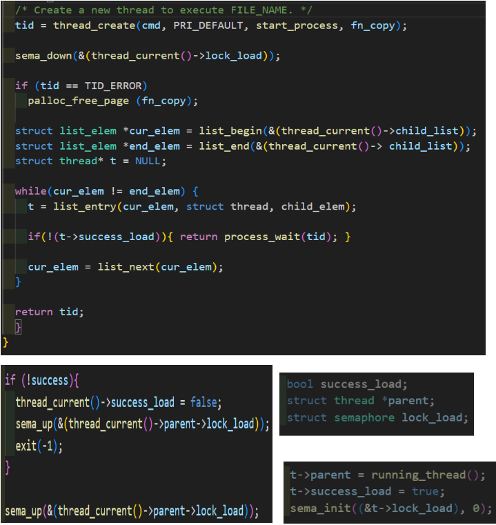 parent thread는 child thread의 create을 기다려줘야하기 때문에 process_execute에서 semaphore lock_load를 통해 해결해주었다. thread.c에서 thread.h에 선언한 lock_load를 sema_init(0) [lock이 걸린 상태]로 통해 초기화 해준 후, parent thread가 child thread를 create하고 load할 때 sema_up을 통해 semaphore값을 높여준다. 즉, parent thread의 process_wait를 대기하게 만들어준다. 다시 말해 start_process에서 load를 실행시켜줬을때 성공하면 sema_up을 해주고 실패한다면 thread.c 에서 선언했던 load_success true bool값을 0으로 바꿔준 후 sema_up 을 해준다.(load fail한 child thread를 wait 해주기 위해) semaphore값이 1이 되었을 때 sema_down을 통해 parent thread가 실행될 수 있도록 해준다. 즉, parent thread가 실행될 수 있어질 때 child thread를 일일히 확인해가며 load를 실패한 child process 들을 process_wait을 통해 reaping 해준다.