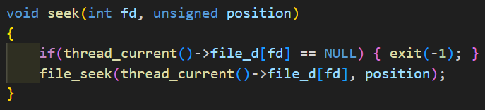 fd number에 해당하는 file descripor가 NULL이라면 exit(-1)을 호출한다. 만약, NULL이 아니라면 file_seek(Kernel API)를 호출하여 pos를 position으로 만들어준다.