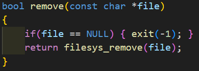 넘겨 받은 file이 존재하지 않다면 exit(-1)을 호출한다. 만약, 파일이 존재한다면 filesys_remove(kernel API)함수를 호출하여 root directory에서 파일을 지운다.