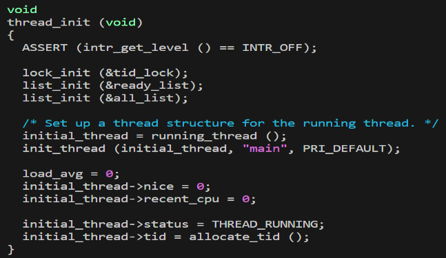 thread.h파일 내의 struct thread에 선언한 recent_cpu, nice를 thread_init 함수에서 0으로 초기화해주었다. 또한, load_avg 역시 0으로 초기화해준다.