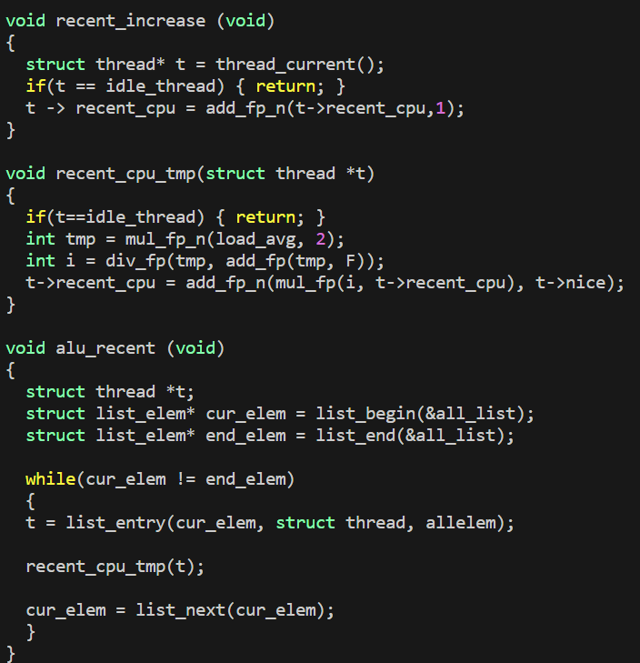 recent_cpu 연산을 위한 함수들이다. recent_increase 함수에서 current thread가 idle thread가 아니라면 1씩 증가시켜주도록 구현하였다.alu_recent는 모든 thread들을 순회하면서 recent_cpu를 update하는 함수이다. recent_cpu_tmp 함수를 사용하여 update를 진행해 주는데, 만약 전달받은 thread가 idle thread 라면 역시 return 해주고 아니라면 제공된 ppt를 기반으로 하고, alu.h 파일 내의 fixed-point 연산 함수들을 사용하여 적절하게 계산해주었다.