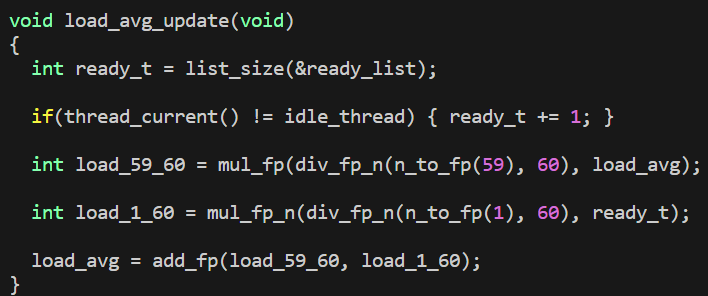 load_avg를 update 해주는 함수이다. ppt를 기반으로 작성하였다. idle_thread일때는 ready_threads의 수를 세지 않아야하기 때문에 조건문을 집어넣어 주었고, floatint-point 대신 fixed-point 연산을 적절하게 사용해주었다.
