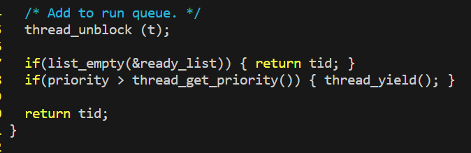 thread_create함수 에서는 새롭게 thread가 create되었을 때 running thread의 priority(trhead_get_priority() 로 가져온다)와 비교하여 더 높은 priority인 thread가 들어오면 yield 하게끔 해주었다. ready_list의 empty 여부를 list_empty로 확인해줘야지 make check 시 assert warning을 방지할 수 있다.