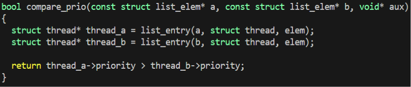 priority가 높은 순으로 정렬하기 위해 2개의 ready list 내 thread의 priority를 위와 같이 비교해주는 함수를 만들어주었다. thread.c에 구현하여 사용하였다.