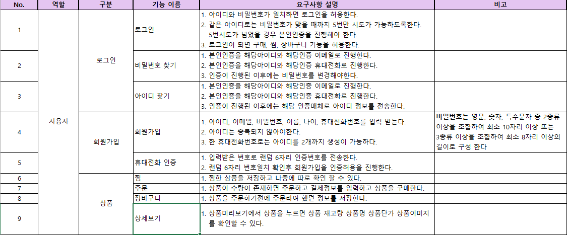 간단하게 쇼핑몰 프로젝트를 설계하기 위해서 요구사항 정의서 초안을 작성합니다.