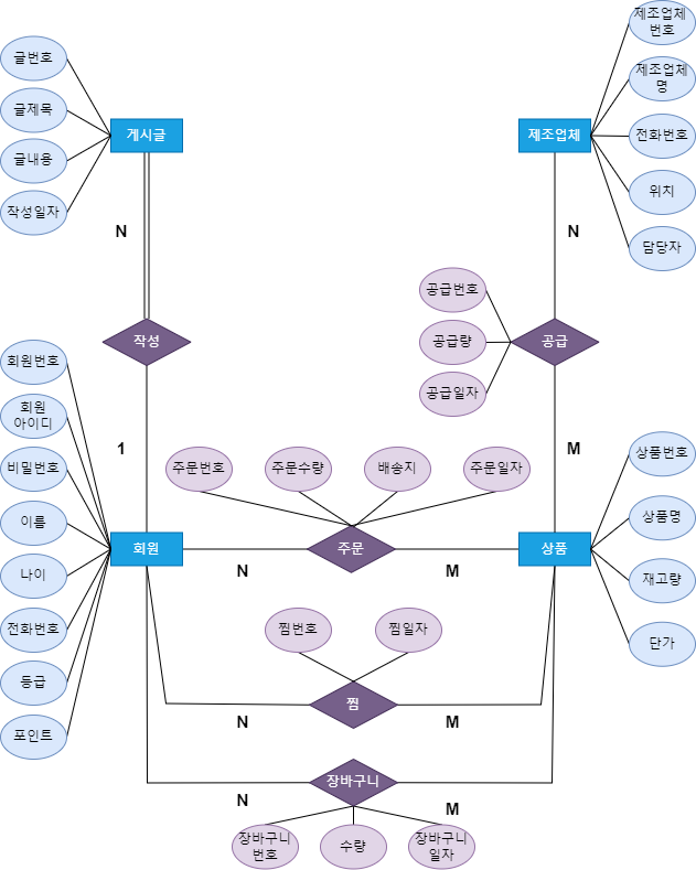 - 회원: 속성으로는 회원번호 (Primary Key), 회원아이디, 비밀번호, 이름, 나이, 전화번호, 등급, 포인트를 가집니다.