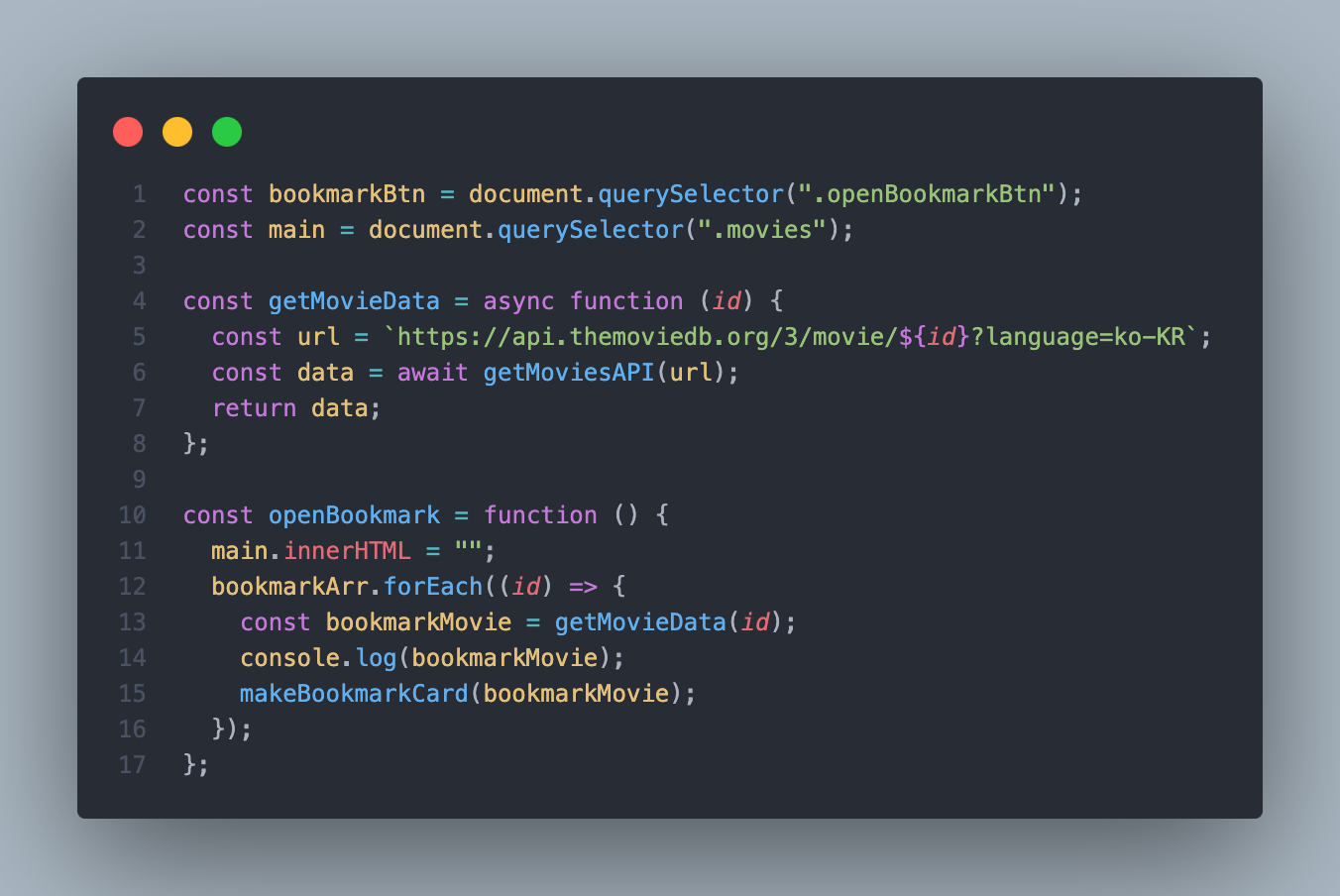 getMovieData 함수가 Promise를 반환하다 보니 데이터를 제대로 못 가져오는 문제가 생겼다.