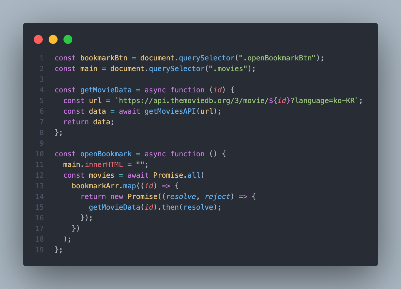 1. bookmarkIds.map → 각 id를 이용해 getMovieData를 호출하고 Promise 배열 생성
