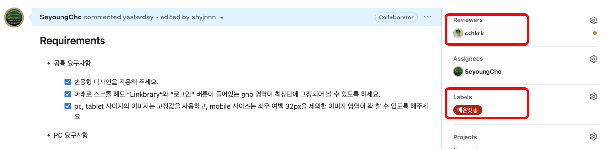 PR방식도 독특하다. 셀프 머지를 한 뒤 closed된 PR을 개발자들이 검토하고 리뷰를 해 준다. PR을 작성할 때는 과제의 요구사항을 잘 반영했는 지 체크리스트를 만들어 구현이 된 부분과 다 구현하지 못한 부분을 구분하여 올린다. 다음과 같이 배정받은 멘토를 태그하고, label에는 매운맛, 순한맛, 미완성이라는 세 가지 라벨 중 하나를 골라 넣는다.