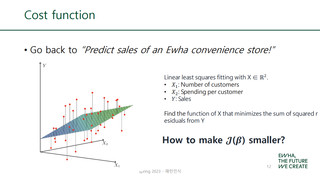 cost function은 형태가 다양한가 보다. 그래도 제곱+ 들어간 걸 제일 많이 쓰지만... 후에 나올 LSE랑 형태가 겹쳐서 그런가? 왜 여기선 이렇게 되어 있는지 영 모르겠지만 암튼 교수님은 이렇게 소개하셨다.