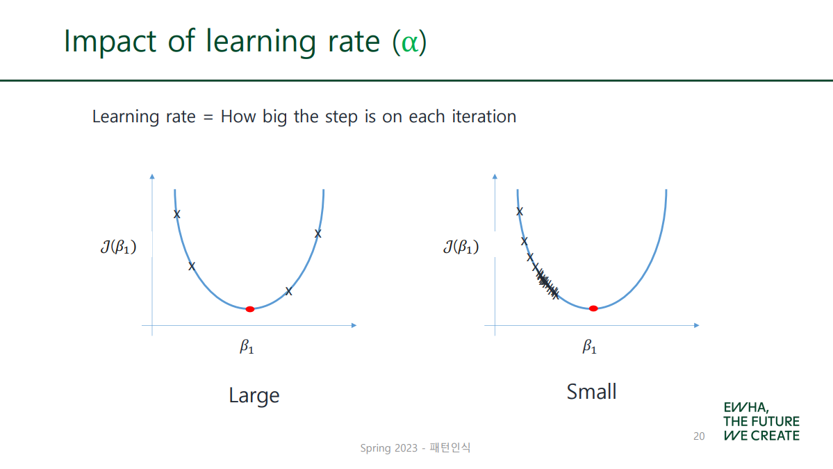 learning rate(α)가 크면 each step도 함께 커짐