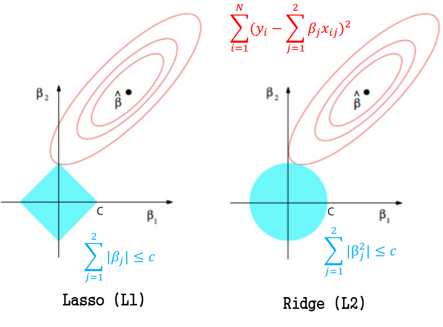 - Diamond, circle plots: constraint regions(제한 영역?)