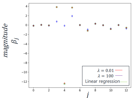 람다값이 클수록, 파라미터의 제곱의 값이 클수록 큰 폭으로 정규화되는 것을 확인할 수 있음. (λ=100인 파란 점)