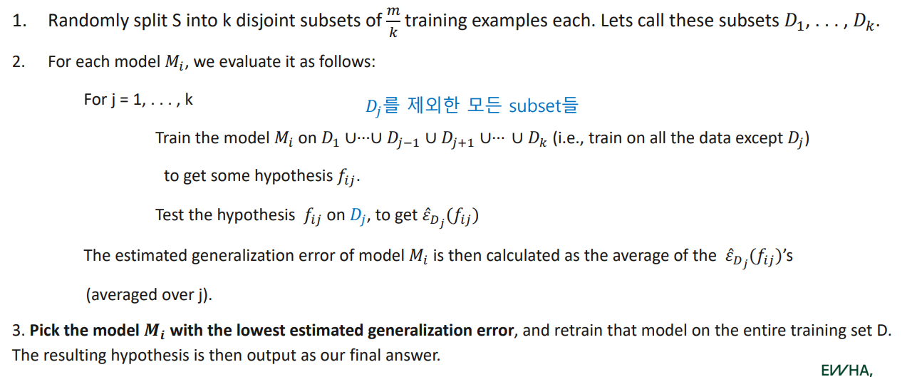 여러 개의 모델 에 대하여 estimated generalization error가 가장 작은 것을 선택하고, 전체 training set 으로 다시 학습시켜 최종 hypothesis를 구한다.