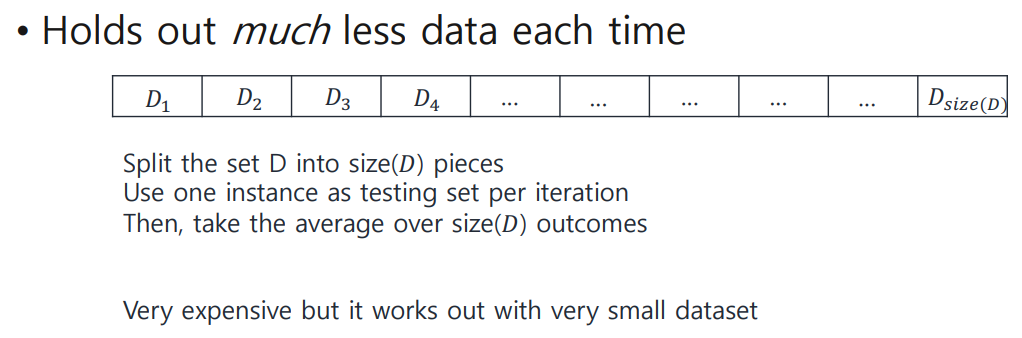 값을 따로 지정하는 것이 아니라, 전체 data 개수로 아예 split해버리는 것! 개만큼의 subset이 생기며, k-fold와 마찬가지로 하나씩 testing set으로 사용하고 결괏값의 평균을 구하게 된다.