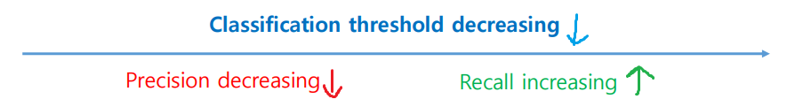 즉 threshold를 감소시킬수록 positive로 예측하는 sample도 많아지므로 precision이 감소하는 것!