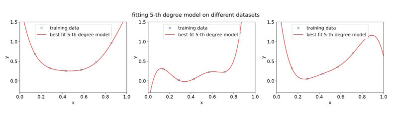 high variance는, 같은 distribution을 따르는 data 내에서 뽑은 서로 다른 training set들로 여러 model을 구축했을 때, 이 model들 간의 variance의 양이 큰 것