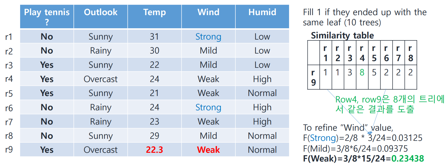 missing value가 존재하는 r9(9번째 행)을 기준으로 살펴보자. r9를 제외한 8개의 row를 모두 feed했을 때, r9와 같은 결괏값이 나온 tree의 개수를 세어 적는다.