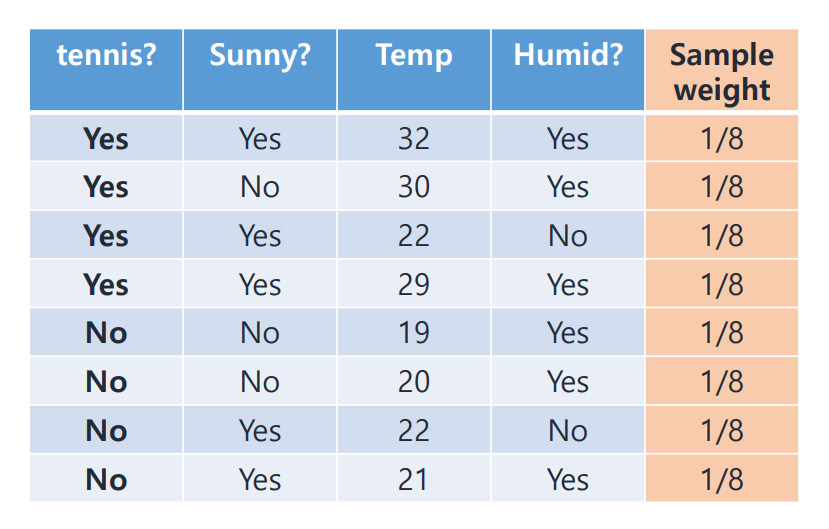 우선 각 sample에 대한 initial weight를 1/8로 설정한다.